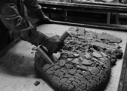 濃縮して固形になったきび汁を鉄板の上で、手早く型押し。均等になるよう、特製のへらで手早く広げる。